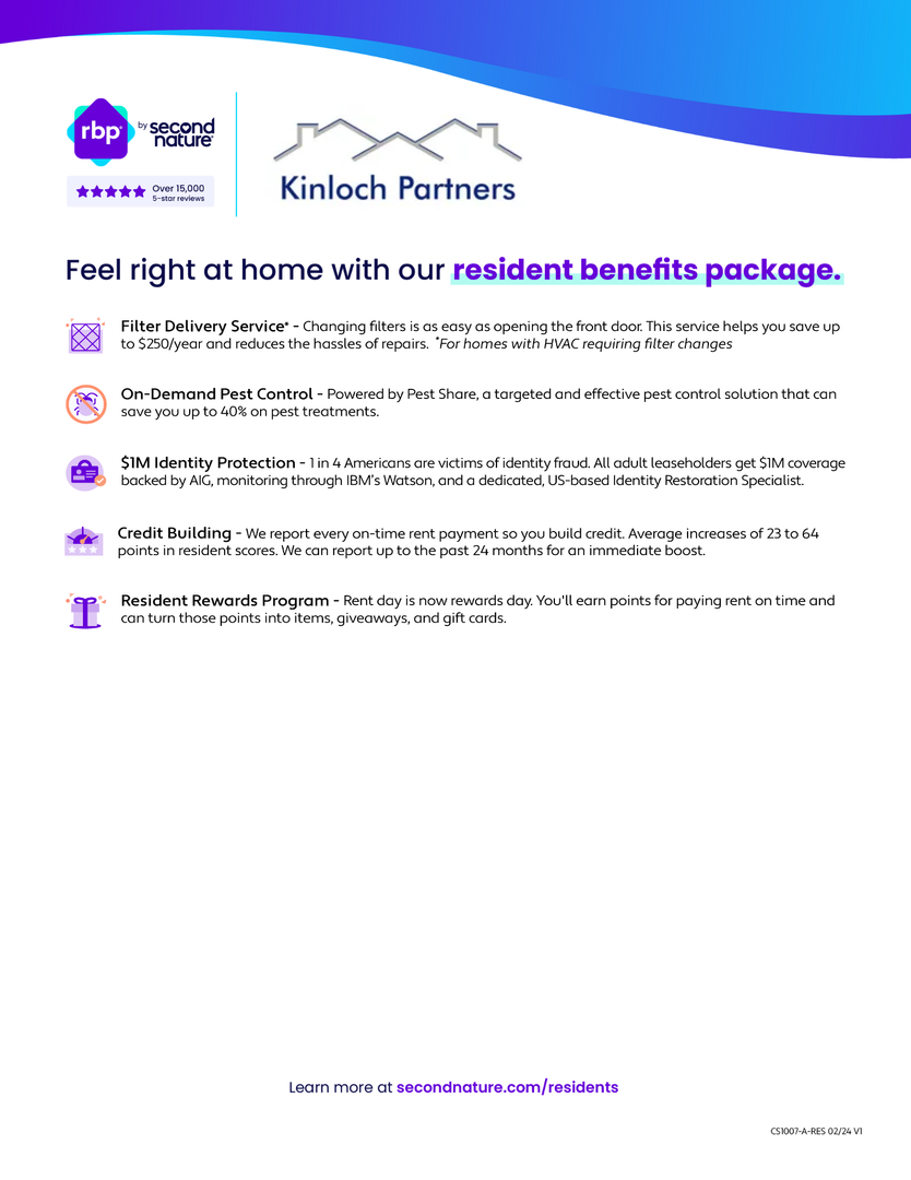 Additionally, residents benefit from our Resident Benefit Package, a quality-of-life enhancement that streamlines home services, provides added protections, and delivers peace of mind—allowing you to focus on enjoying your home rather than managing it.
